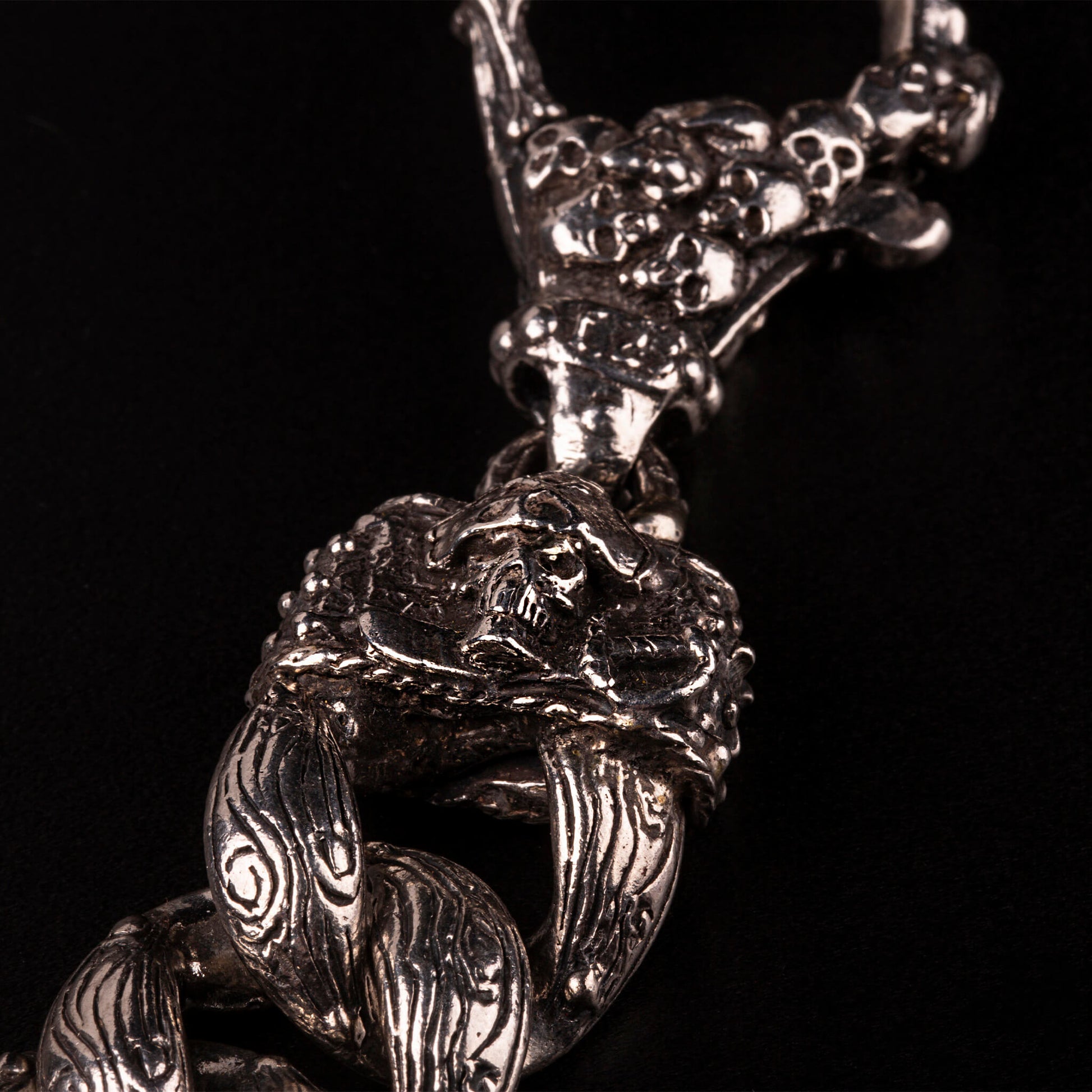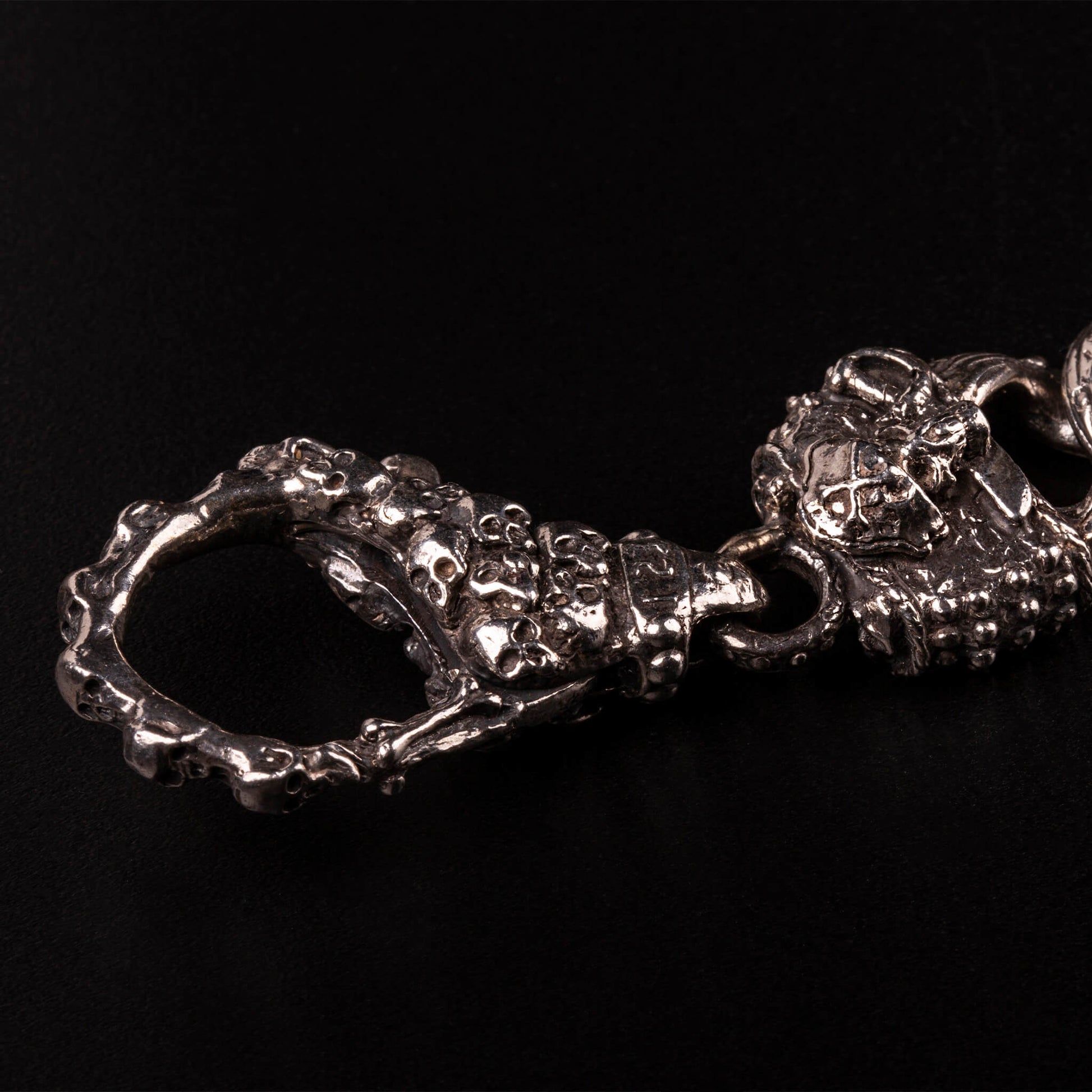 A chiudere il pezzo, un moschettone finemente lavorato con una distesa di piccoli teschietti, incisi con pazienza, quasi fossero anime silenziose rimaste incatenate a bordo.