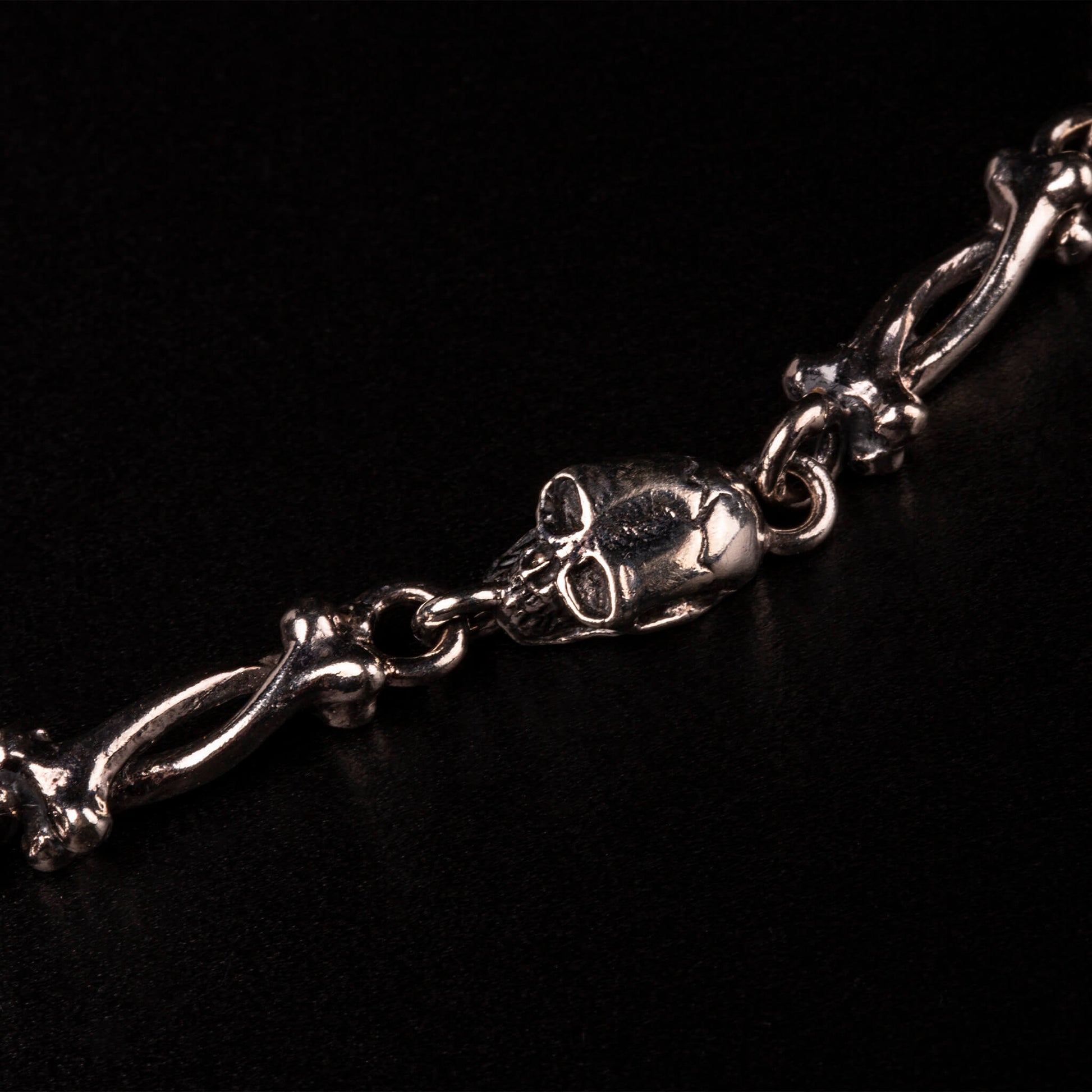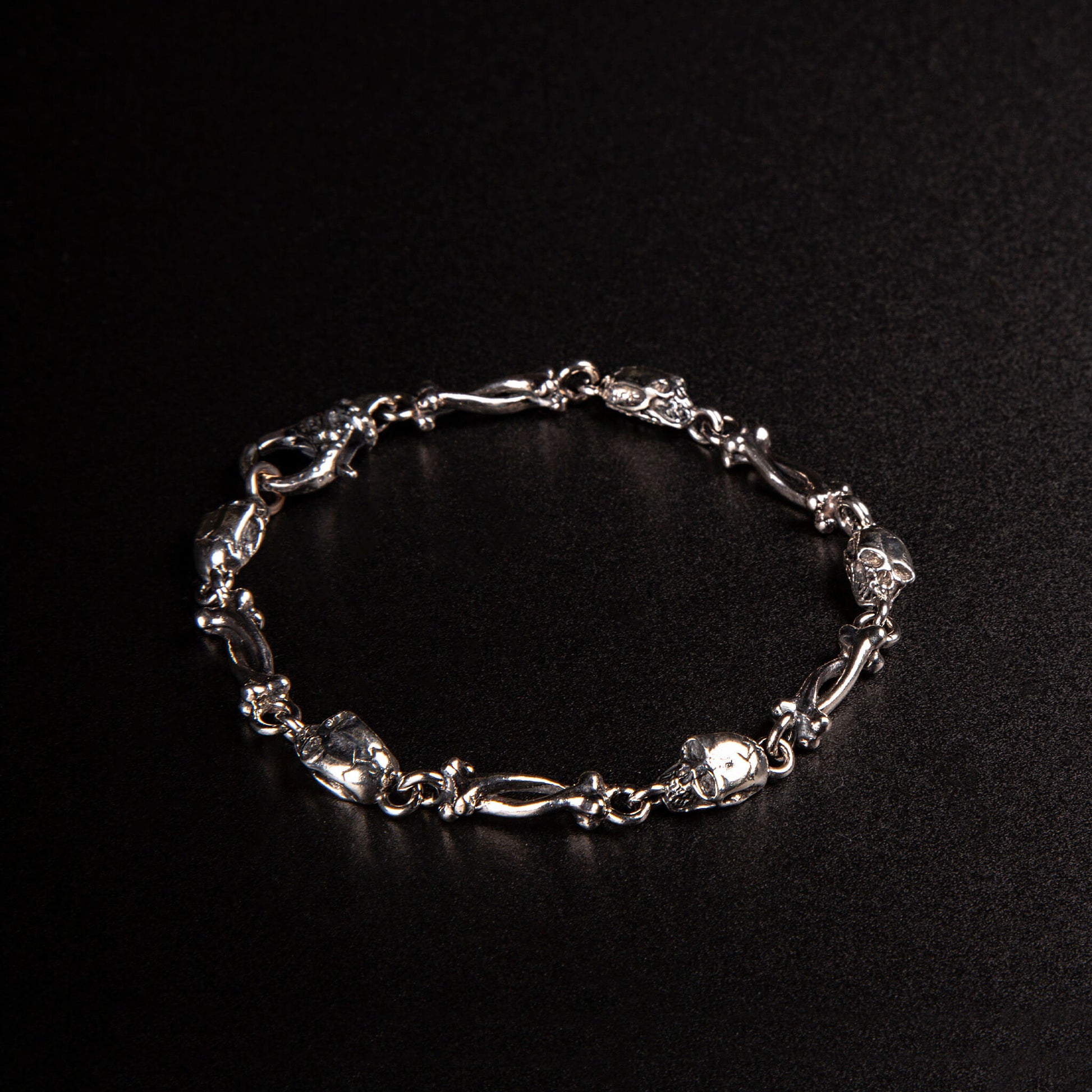 Il bracciale in argento 925 "Skull & Bones" alterna piccoli teschi e ossa lavorate a mano, per un effetto organico e graffiante. È un gioiello discreto ma pieno di carattere, pensato per chi vuole un pezzo autentico, da portare sempre.