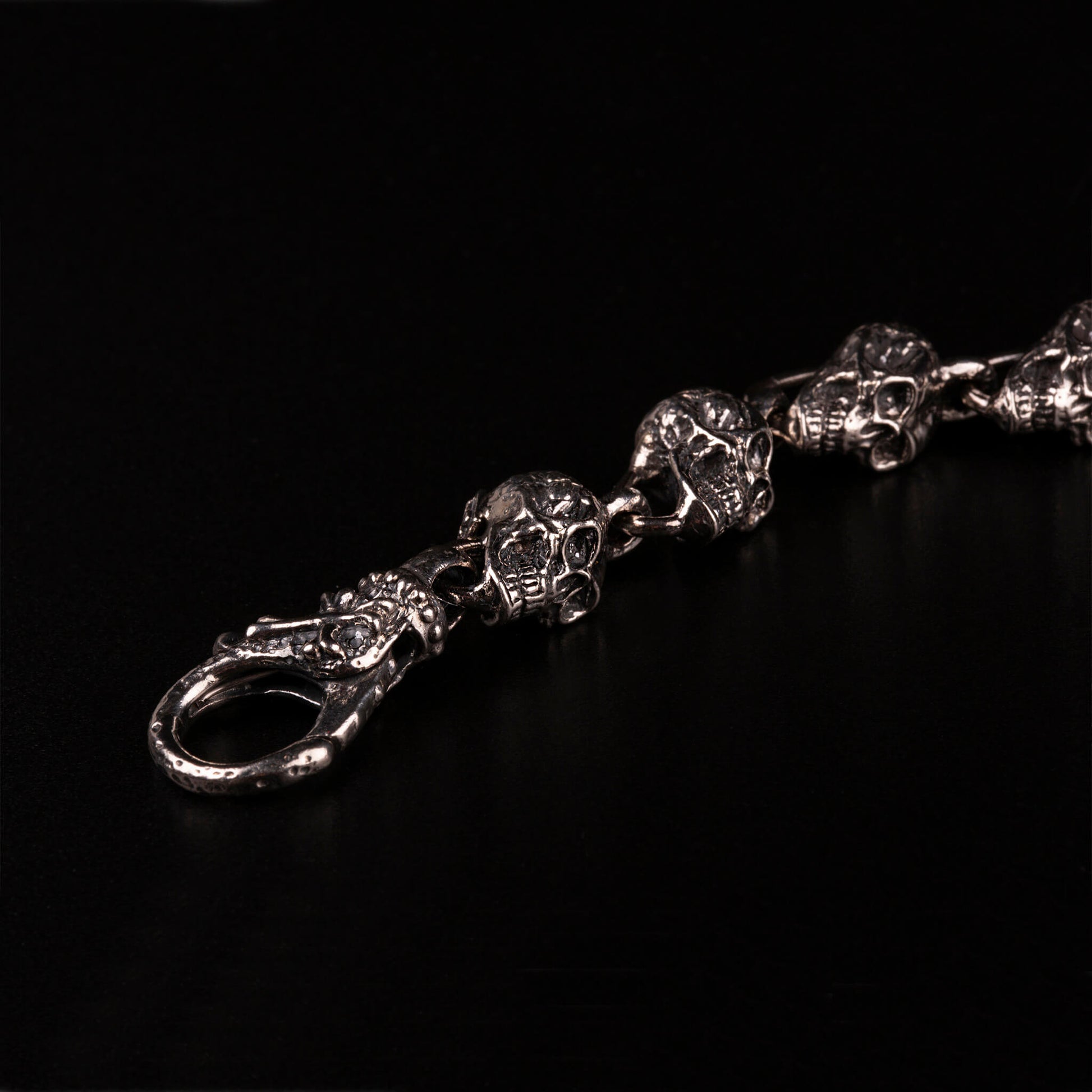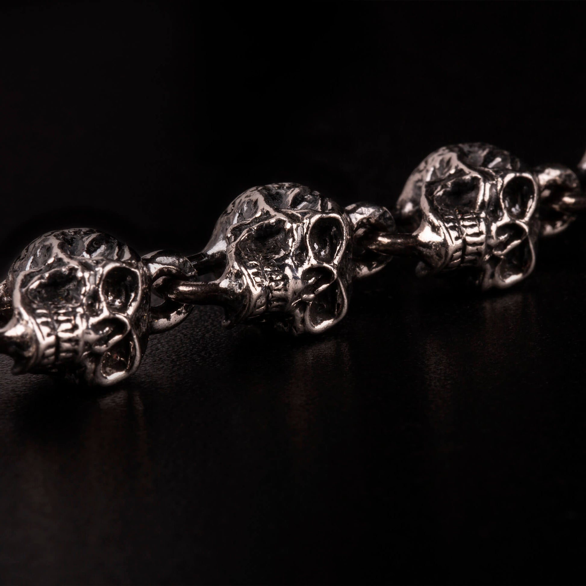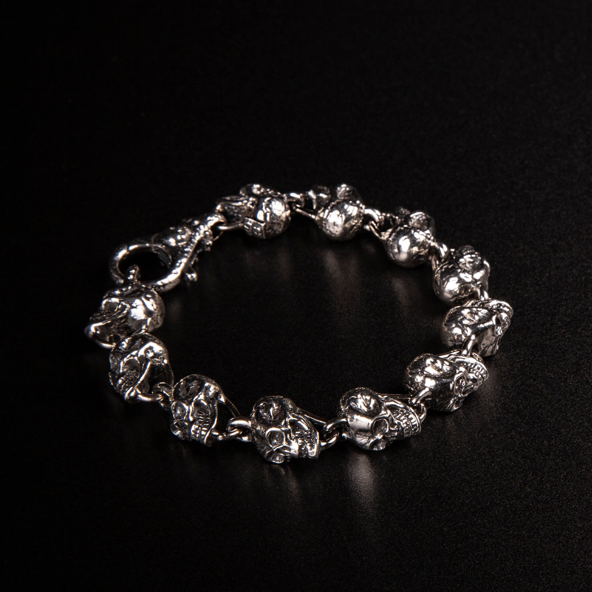 Bracciale in argento925 composto da una serie di teschi interi, scolpiti e fusi uno a uno in Argento 925, uniti tra loro da robuste maglie lavorate a mano. Ogni teschio è diverso, come lo è ogni storia. Ma insieme formano una catena: solida, graffiante, vera.