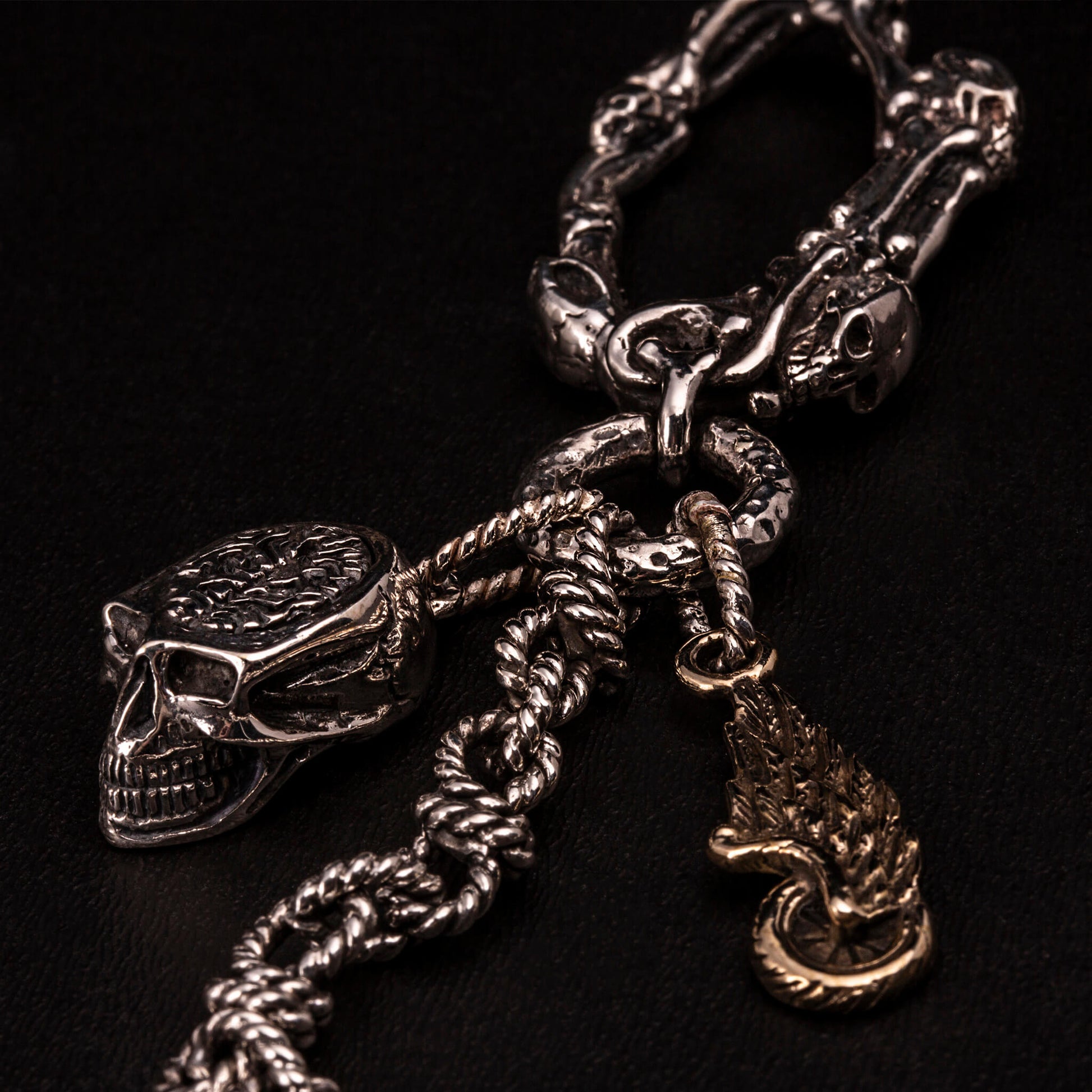 Ma si sentono. Ti seguono. Ti tengono saldo. Il moschettone a molla, scolpito con ossa incrociate e piccoli teschi, è a sua volta un elemento protagonista, completato dai pendenti iconici del brand: la targhetta con ruota e ala, un cranio cesellato con finitura brunita.