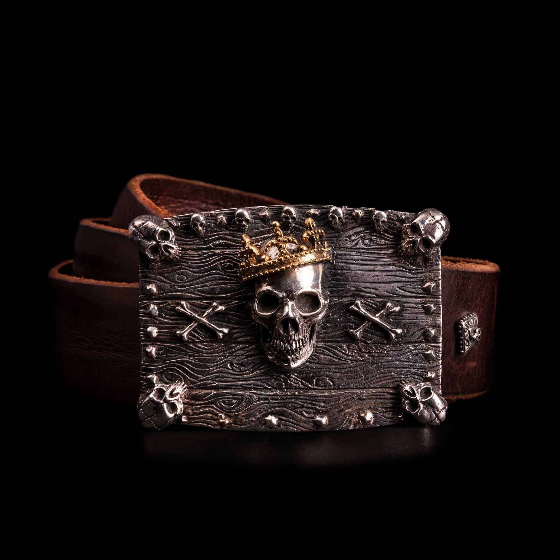 Una piastra rettangolare lavorata con venature effetto legno, come il legno consumato di una vecchia nave. Al centro domina un teschio anatomico in tridimensione, sormontato da una corona: simbolo di chi guida la propria rotta, senza chiedere permesso.